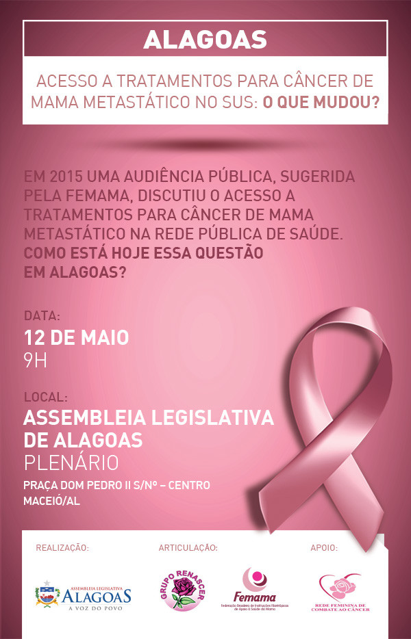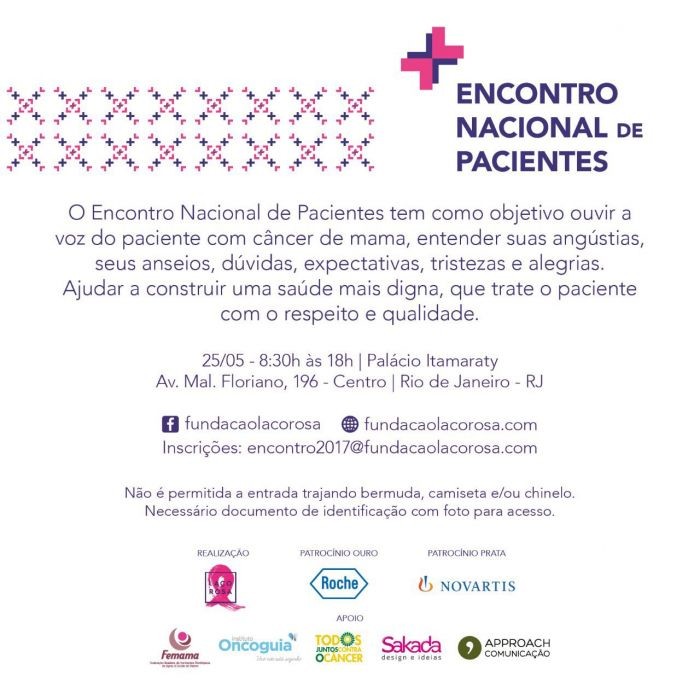 Durante a próxima semana, a Fundação Laço Rosa, associada FEMAMA no Rio de Janeiro, deve realizar dois eventos: o Encontro Nacional de Pacientes, no dia 25, e o Fórum de Políticas para o Câncer de Mama, no dia 26. Ambos os eventos têm apoio da FEMAMA.